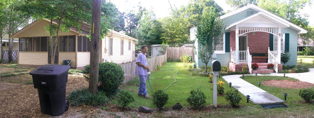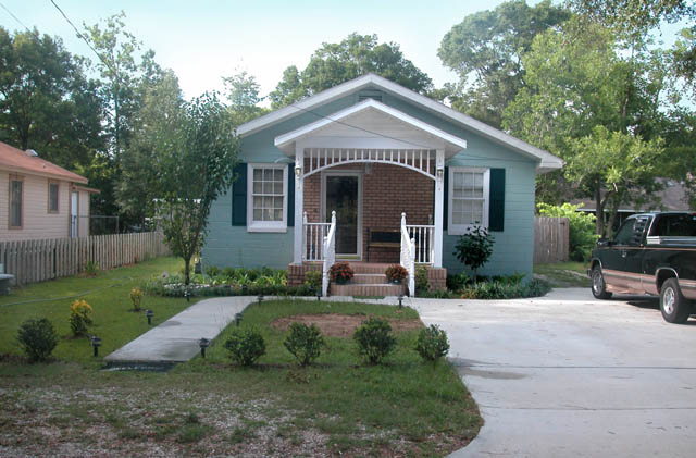 An apron porch with an overhang helps keep the house cool during the hot Gulf Coast summers.