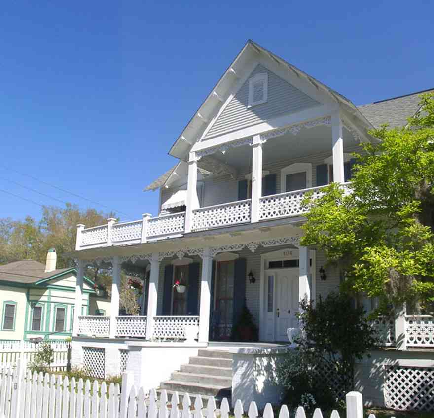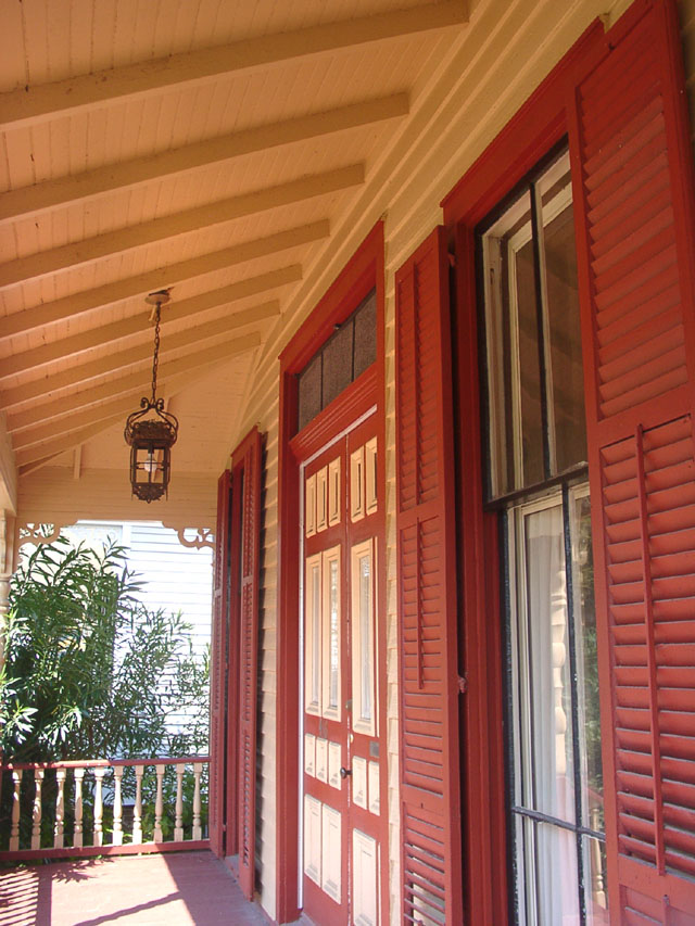 The ceiling of the porch is painted sky blue to "scare" away the haunts or ghosts. The color of the house, shutters and ceiling are traditional and the most popular colors used during the 19th century.