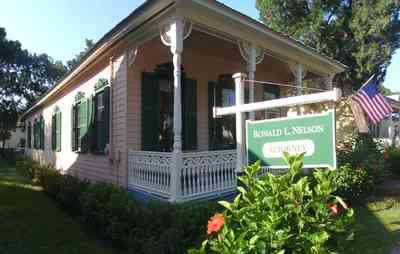 The Julee Cottage is on the north side of Zaragoza Street. The Weavers Cottage can be seen on the right. The cottage rests on brick piers, a typical building feature of early Gulf Coast homes. This slight elevation to the building helps provide air circulation.