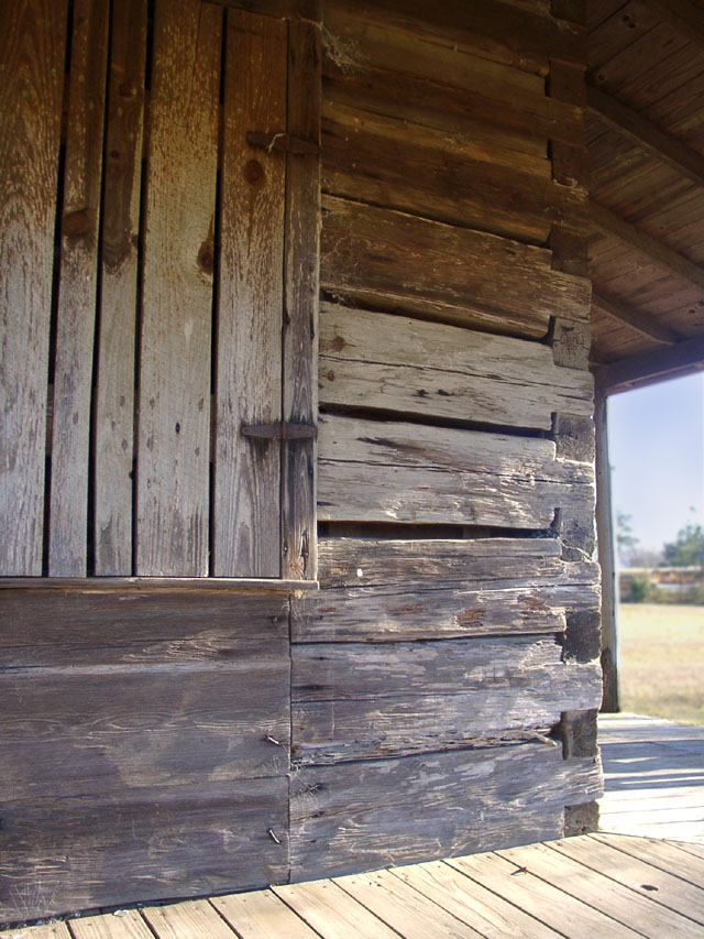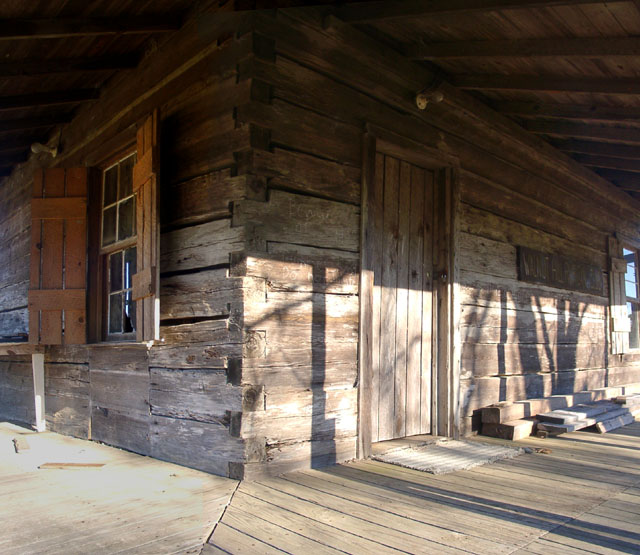 The corner of the building shows square-hewn log construction with dove-tail notching.
