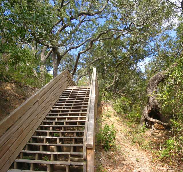 The steps lead into a shallow area. The pond was used as a swimming pool.