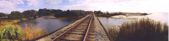 The CSX trestle crosses the mouth of Bayou Texar. The tracks continue along the red clay bluffs of Scenic Highway.