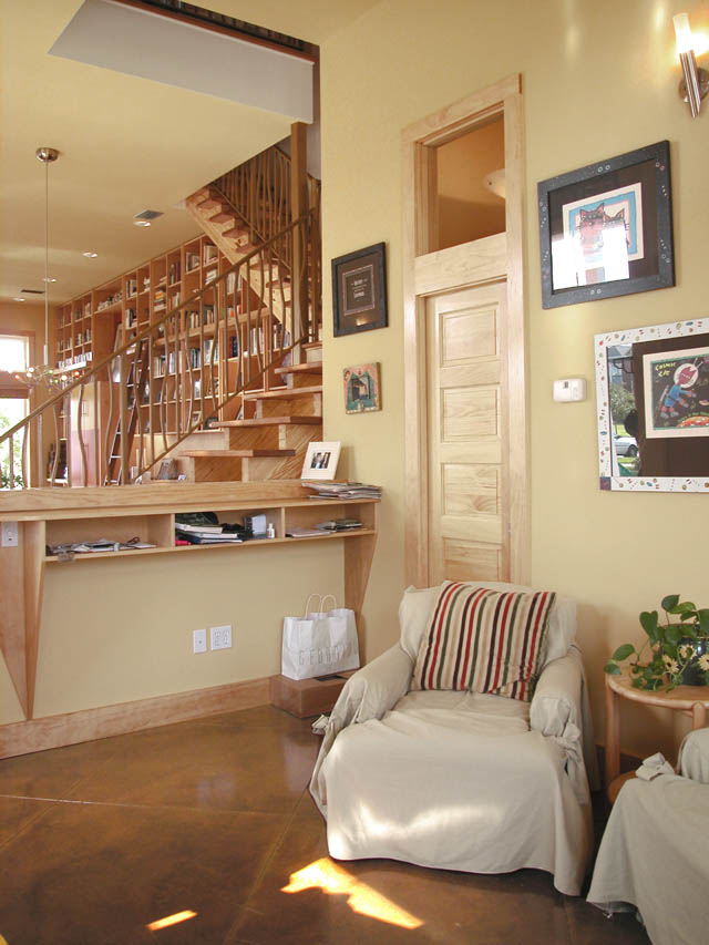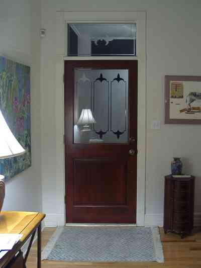 The door glass was etched with a fleur de lis motif to show the French heritage of Lucy Reser. The drawing on the right wall is entitled "Donkey" and was done by a friend of Lucy's who is an artist exhibiting in NYC and Washington, D.C.