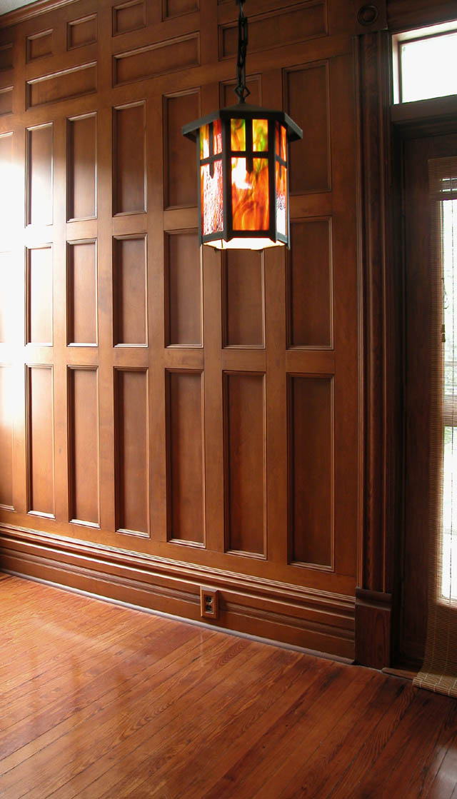 Beaded wood panels were installed beneath windows and in the stairwell whose railing desing duplicated that of the main house.
