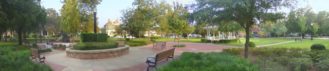 The central focus of the park is the circular seating area near the gazebo.