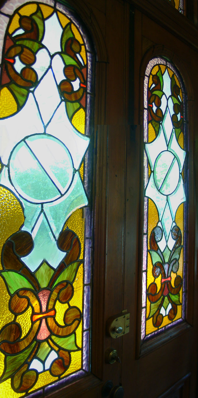 The elaborate stained glass doors lead out onto the back porch.