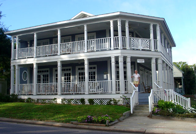 An apron porch with an overhang helps keep the house cool during the hot Gulf Coast summers.