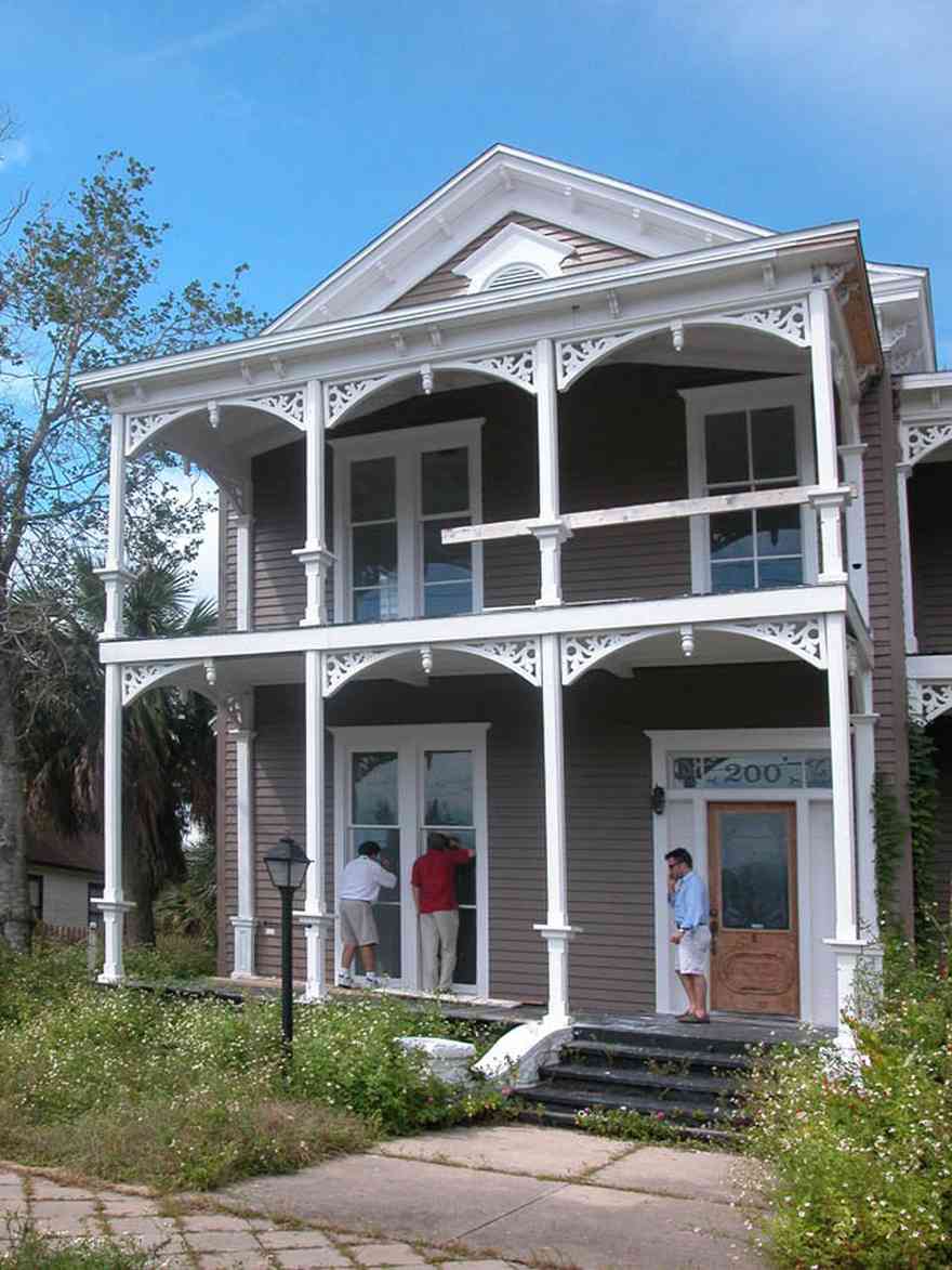 The Victorian house is in the process of being converted from an office into a residence. The design of the gingerbread coumn brackets is art nouveau, a style of decoration developed in France at the end of the 19th century characterized by flowing lines and curving organic shapes.