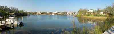 The house is visible in the upper right of the frame. The photograph is taken from the vantage point of the channel, facing southeast. The swing is on the lower right of the frame.