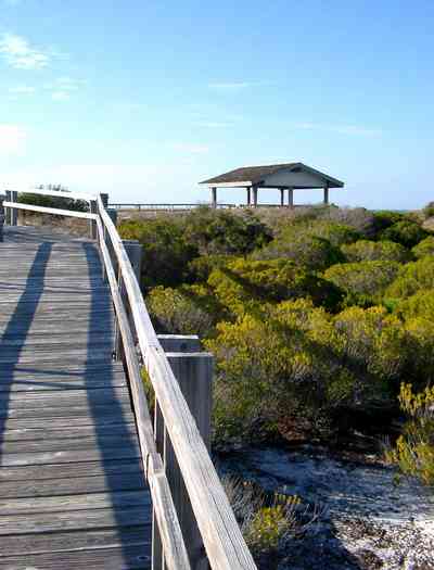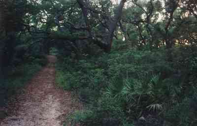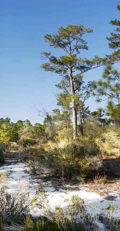 Saw palmettos and oak trees line old Pensacola-St. Augustine road which parallels US 98 for 2.2 miles and is the longest foot trail in this part of the park. It is also one of the last remaining remnants of Florida's first highway. Today it passes through an interesting collection of coastal habitats that include sand pine scrub, and harwood hammocks, characterized chiefly by live oak, southern magnolia nd pignut hickory.