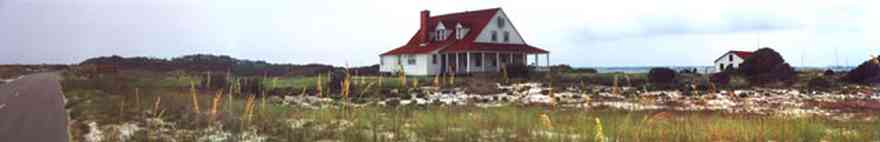 The back porch view shows the shallow width of Dead Man's Island. The bay side of the island has narrow dune formations. Sea grasses and trees are the vegetation on the channel side of the island.