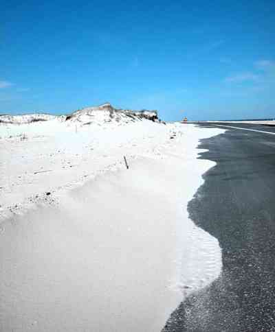 Barrier beaches are one of the world's most restless landforms. As can be seen above the tress are growing on shifting sand which looks like snow.