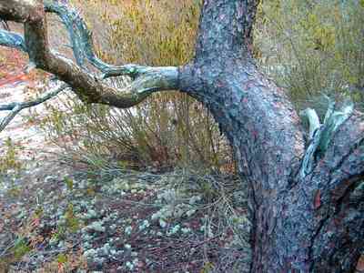 Lichens and mosses grown on the scrub pine trucks.